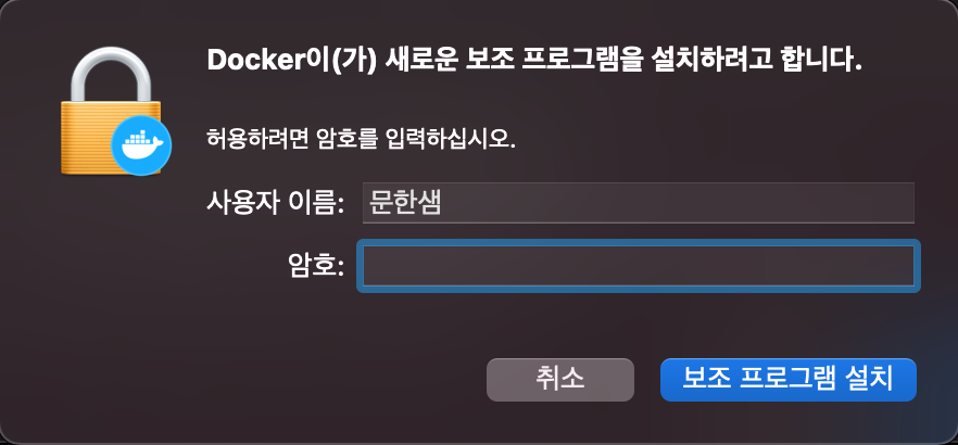 Docker를 사용하기 위해 권한 액세스가 필요하다며 아래와 같이 관리자 권한관련 창이 뜹니다.