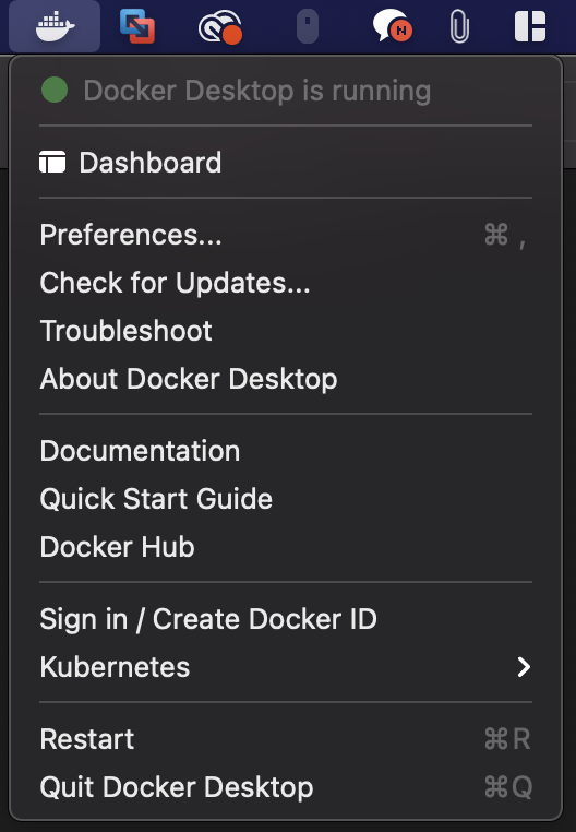 상단바를 통해 Docker Desktop is running 인지 확인해주세요~