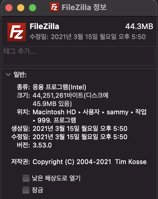 응용 프로그램(Intel)은 앱이 Intel 프로세서만 지원하며 Apple Silicon이 탑재된 Mac에서 작동하려면 Rosetta가 필요함을 의미합니다.